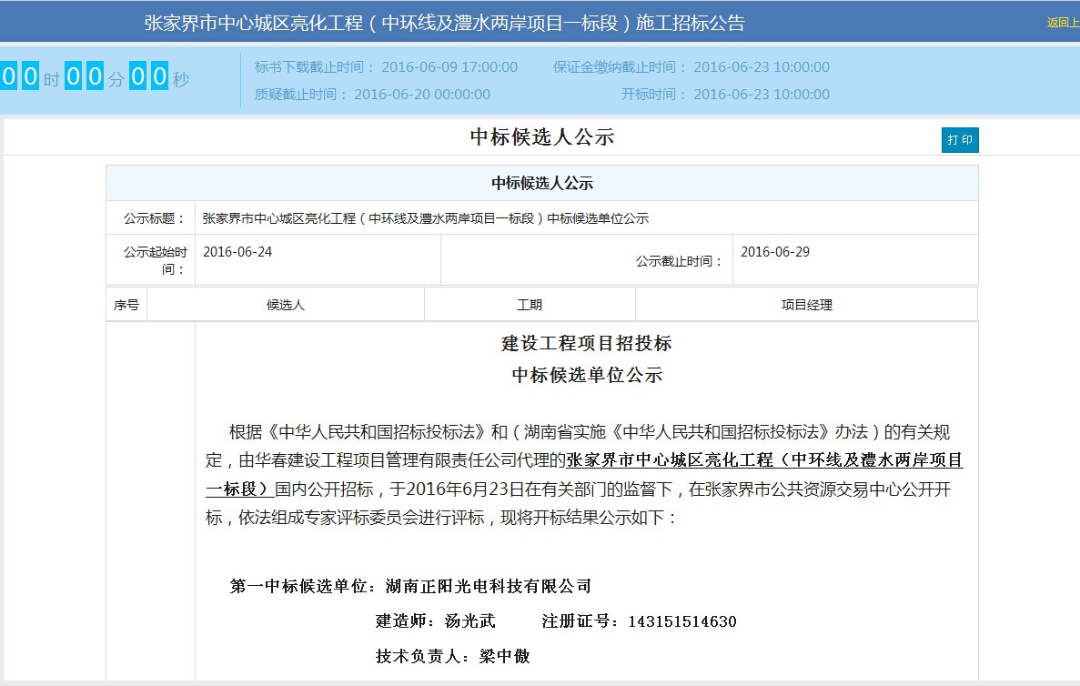 2016年6月24日,湖南省正陽光電科技有限公司成功中標張家界市中心城區(qū)亮化工程(中環(huán)線及澧水兩岸項目一標段)。